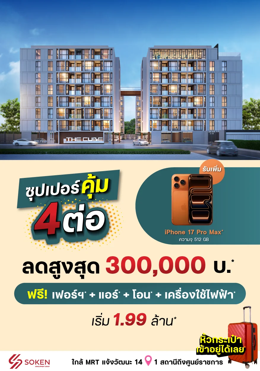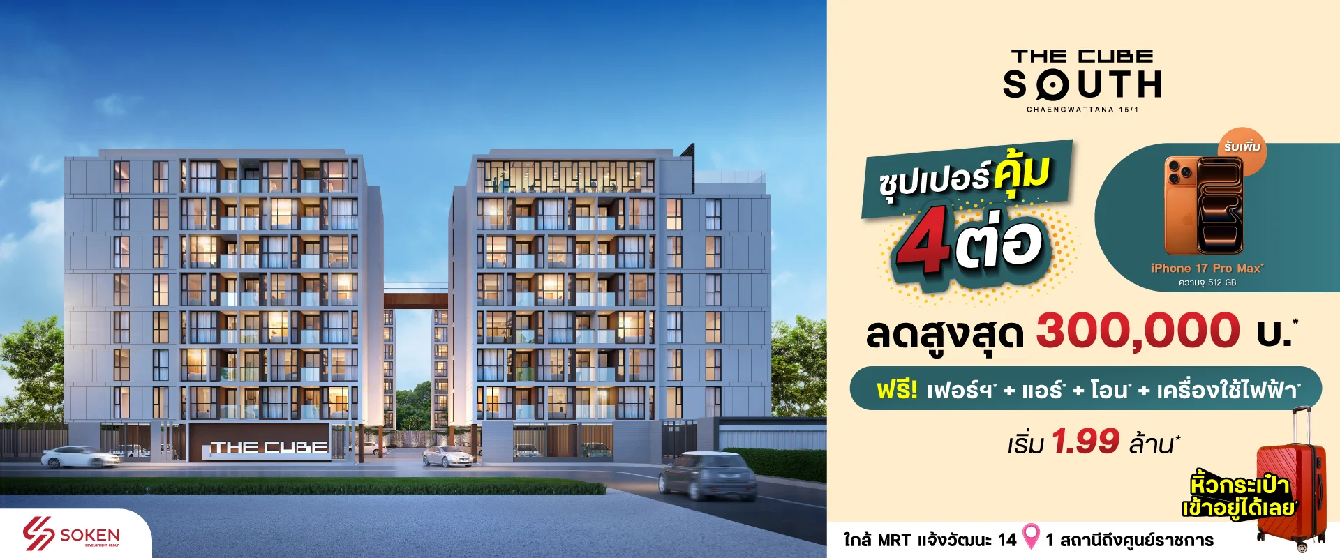 เดอะคิวบ์ เซาท์ แจ้งวัฒนะ 15/1 คอนโด Low-Rise สไตล์รีสอร์ท ความสูง 8 ชั้น 4 อาคาร พื้นที่โครงการ 3 ไร่ 31 ตร.วา. โดยประมาณ จำนวนห้อง 391 ยูนิต มีห้องพักให้เลือกแบบ 1 Bedroom, 1 Bedroom Plus และ 2 Bedrooms ขนาดเริ่มต้น 25.5-43.00 ตร.ม. พร้อมสิ่งอำนวยความสะดวกพิเศษสุดทุกรูปแบบและส่วนกลางลอยฟ้าบนชั้น 8 ทั้ง 4 อาคาร ที่สามารถทำกิจกรรมได้ตลอดทั้งวัน เชื่อมต่อเข้า-ออกเมืองได้ง่ายด้วยทางพิเศษศรีรัช และ ดอนเมืองโทลล์เวย์ ใกล้ รพ.มงกุฏวัฒนะ, ศูนย์ราชการแจ้งวัฒนะ, บิ๊กซี แจ้งวัฒนะ